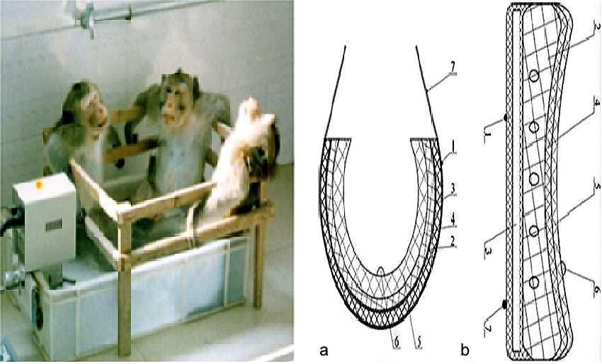 Figure 2.TTH for animals and humans. Left, water bath for monkeys. Right, designed sketch of scrotal heat stress device (heating underpants). No. 1 and 7 show the fixed belts, No. 2 shows the water bag, No. 3 shows the electric heating pad, No. 4 shows the protective layer of the water bag, No. 5 shows the thermal insulation layer and No. 6 shows the temperature probe which links with a digital display. (a) vertical section map of scrotal heat stress device, (b) cross-section map of scrotal heat stress device. This Figure is modified with permission from (21).