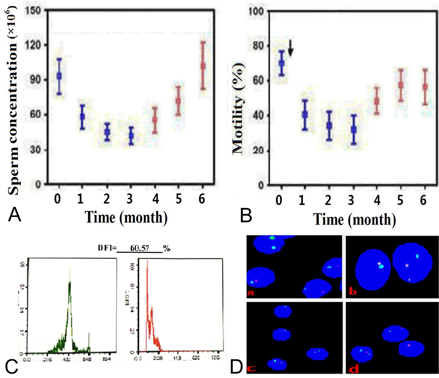 Figure 3.Changes in sperm parameters, DNA fragmentation and chromosomes under TTH. In addition to mice, primates such as monkey and humans are used to assess the role of TTH on spermatogenesis and male fertility. TTH leads to changes in sperm quality (e.g., sperm concentration, motility, morphology, and membrane characteristics), sperm DNA (e.g., chromosome structure, caspase activity, and acrosin), and several important biochemical substances in seminal plasma. (A) and (B) Sperm concentration (left) and motility (right) before, during and after scrotal heating. This Figure is modified with permission from (22). (C) DFI from SCSA under TTH. (D) Sperm FISH assay. (a) and (b), sperm chromosome X centromere (green), chromosome Y centromere (red) and chromosome 18 centromere (blue) specific probes. (a) Before TTH, spermatozoa with one chromosome Y (3 spermatozoa) or one chromosome X (one spermatozoon) and onechromosome 18. (b) during TTH 3 months, a spermatozoon with 2 chromosomesY and one chromosome18 (the right). (c) and (d), sperm chromosome 13 centromere (green) andchromosome 21 centromere (red) specific probes. (c) before TTH, spermatozoa with one chromosome 13 and one chromosome 21. (d) during TTH 3 months, a spermatozoon with one chromosome 13 and one chromosome 21 (the top) and a spermatozoon with two chromosomes 13 (the bottom left) and a spermatozoon with one chromosome 21.