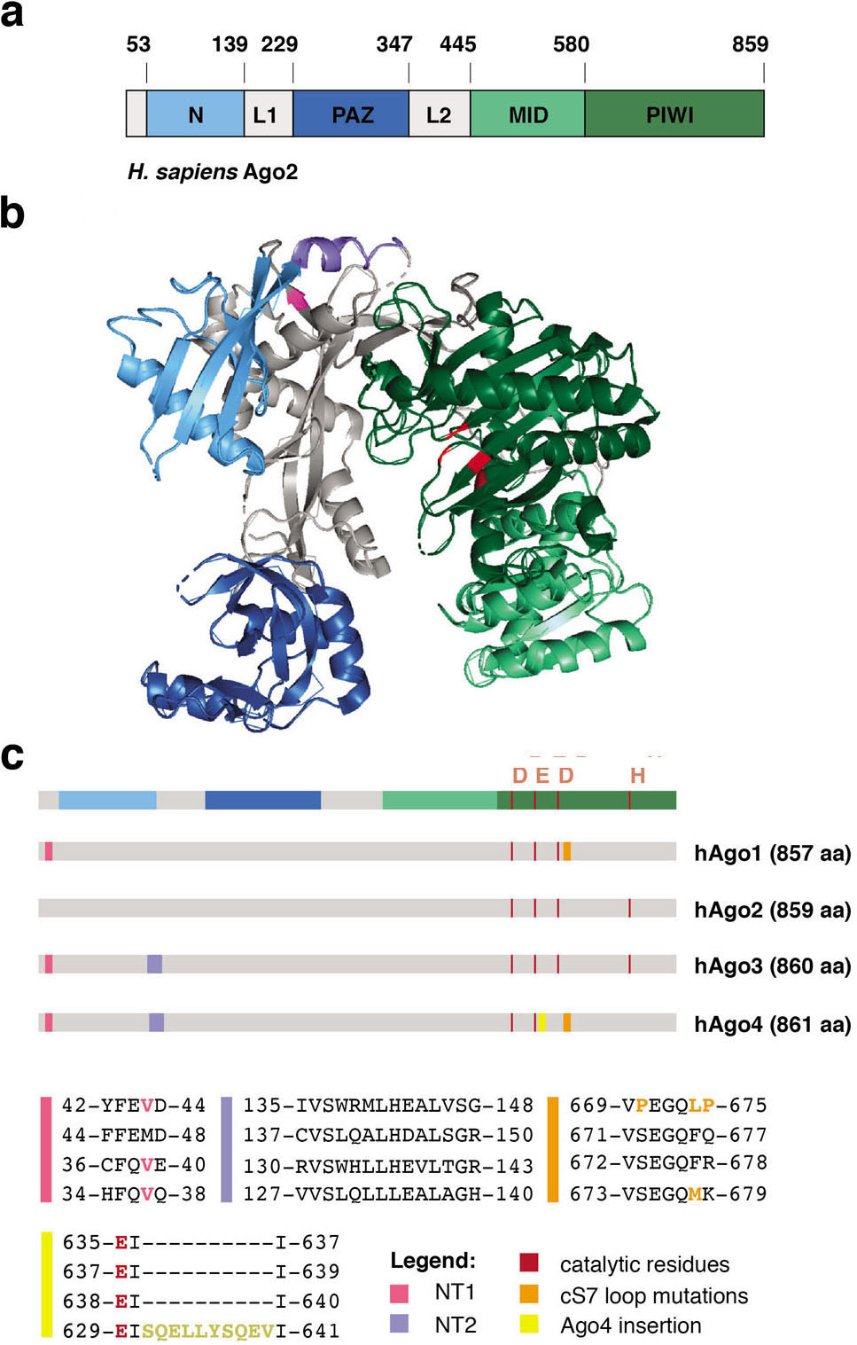 Figure 1Structure of mammalian Argonaute proteins. (a) Schematic representation of human Ago2, showing the position of functional domains along the peptide sequence. (b) Crystal structure of human Ago2 (10). Protein domains are colored as in (a). In addition, the position of residues important for catalytic activity are highlighted as in panel (c). (c) Schematic representation of all four human Argonaute proteins highlighting the location of amino-acid sequences known to play a role in cleavage competence. The general position of functional domains is shown on top. The specific amino-acid sequences for each of the proteins is are shown below.