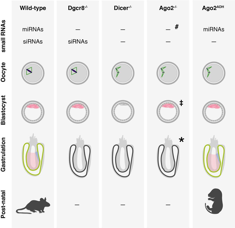 Figure 2Summary of developmental phenotypes observed in mice carrying targeted deletions of components of the miRNA and siRNA pathways. The small RNA pathways that are affected in each genotype are shown on top. Briefly, in the absence of Dgcr8 oocytes mature normally, but loss of Dicer, Ago2 or Ago2’s catalytic activity leads to arrest at meiosis I accompanied by spindle and chromosome segregation defects. At the blastocyst stage, pluripotent cells (pink) are specifically depleted from Dicer-/- embryos. Dgcr8-/- and Ago2-/- have a relatively normal pre-implantation development, but like Dicer-/- embryos do not survive past gastrulation. Finally, animals expressing the catalytic dead Ago2ADH survive up to birth but succumb soon after. #, in Ago2-/- animals the miRNA pathway is impaired but not fully disrupted because the redundancy with other Argonaute proteins; ‡, the presence of pluripotent stem cells in the blastocyst of Ago2-/- mice has not been characterized but is assumed here to be intact based on the phenotypes of ES cells (268); *, three knockout models for Ago2 have been described showing embryonic lethality at different stages. Here we are representing only the most severe phenotype leading to embryonic lethality around gastrulation (see Table 1 for more details).