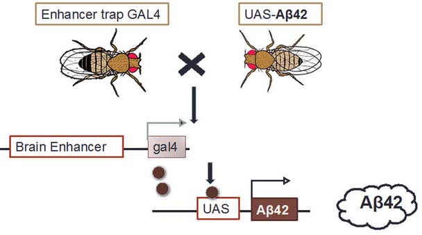 Figure 1Aβ42 expression in Drosophila by the GAL4/UAS system. Driver lines expressing the transcriptional activator GAL4 in a tissue-specific manner are crossed with UAS lines with genomic inserts of a target gene fused to GAL4-binding sites.