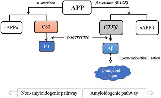 Figure 2In the amyloidogenic pathway, APP is cleaved by the β-site APP-cleaving enzyme (BACE), a soluble sAPPβ fragment that is secreted outside the cell, leaving a membrane-associated C-terminal fragment - CTFβ (99 or 89 amino acids). CTFβ is then cleaved by γ-secretase, generating the Aβ peptide and a cytoplasmic APP intracellular domain (AICD) (65). The Aβ42 peptide is oligomerized and forms aggregates that accumulate in the brain to form plaques.
