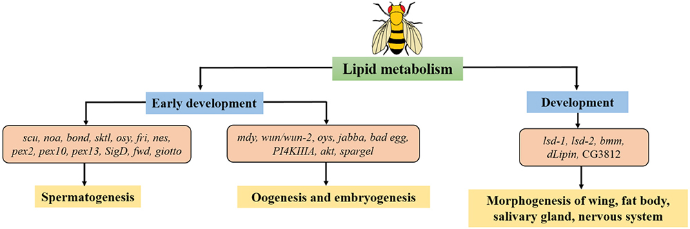 Lipid metabolism relates to different stages of development in Drosophila. There are lipid-related genes function in early development: spermatogenesis, oogenesis, embryogenesis along with late development in life cycle of Drosophila. Genes described in this review are shown.