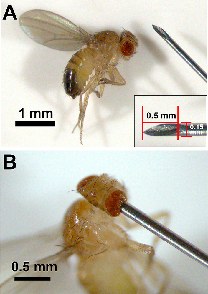 Figure 1Penetrating TBI in Drosophila.A. Tip of the 35G medical needle (React System, Japan) and Drosophila. The diameter of the needle is 0.15 mm, and the length of the cutting face of the needle is 0.5 mm (inset). B. Induction of the penetrating TBI fly model using the needle. The brain damage is induced by stabbing the cut face of the tip of the needle into the fly from the right eye. TBI: traumatic brain injury