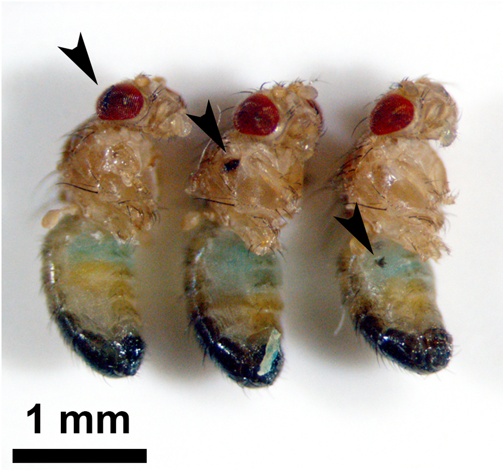 Figure 2Smurf assay in stabbed flies. The fly’s head (penetrating TBI, left), thorax (middle), and abdomen (right) were stabbed using a 35G thin needle. No fly exhibited the Smurf phenotype at one day after injury. Arrowheads indicate the stab wounds. TBI: traumatic brain injury