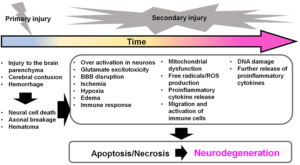 TBI is divided into two stages: primary brain injury and secondary brain injury. The exogenous physical impact to the brain causes primary injuries that include direct trauma to the brain parenchyma, cerebral contusion, blood-brain barrier (BBB) disruption, hemorrhage, and hematoma. These primary injuries induce a cascade of molecular events that cause secondary brain injury (22-24) (Figure 3). The secondary injuries have a complicated molecular pathogenesis that includes an entire series of steps or stages of cellular, chemical, tissue, and blood vessel changes in the brain. These changes produce further cell death and lead to neurodegeneration in the hours to days following the initial damage (Figure 3). Negative effects from secondary brain injury continue throughout the life-course and may cause neurodegenerative diseases in later life stages in humans. Thus, it is very important to understand the molecular mechanisms of secondary brain injury to treat TBI and neurodegenerative diseases. Here, I will discuss the neuroinflammation and excitotoxicity involved, both of which are important initial phenomena in secondary brain injury from TBI.