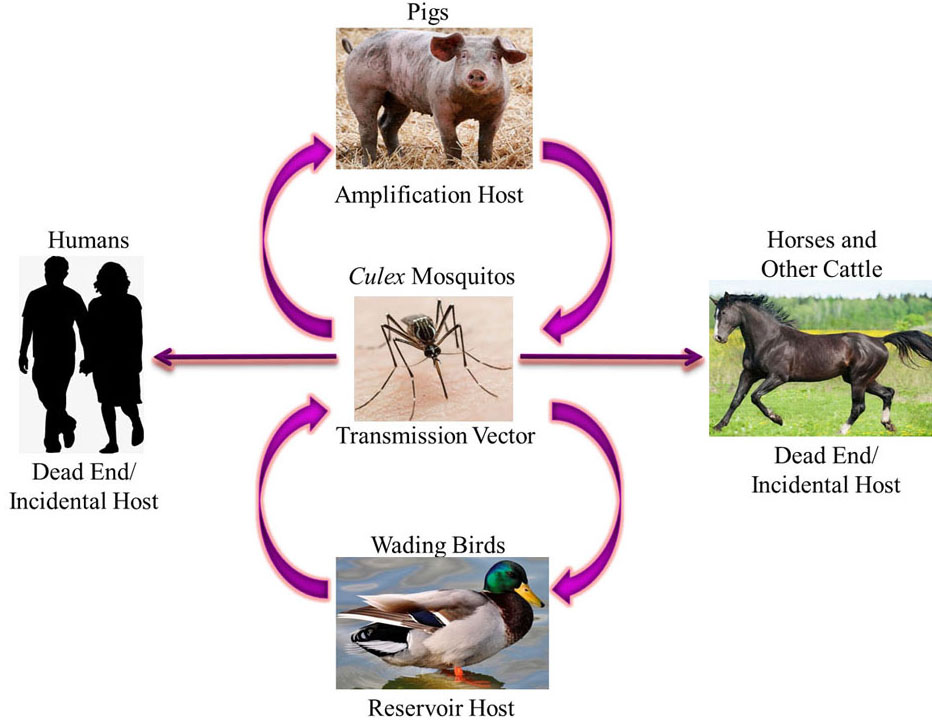 Zoonotic Transmission Cycle of Japanese Encephalitis Virus where Culex mosquitos transmit the virus in a cycle between the amplification hosts i.e. pigs and reservoir hosts i.e. wading birds. Humans, horses and other cattle are incidental dead end hosts as they can get infected but cannot transmit the virus.