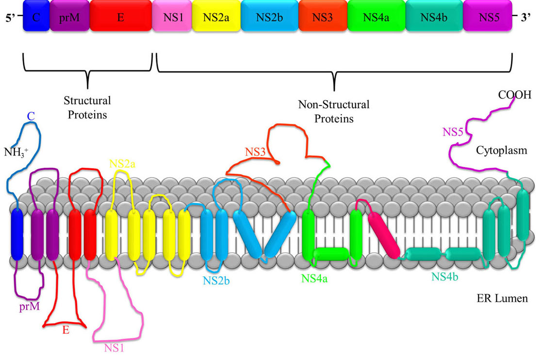 JEV RNA consists of a single polyprotein sequence made up of three structural proteins i.e. capsid (C), pre membrane (prM) and envelope (E), and seven non-structural proteins i.e. NS1, NS2a, NS2b, NS3, NS4a, NS4b and NS5.