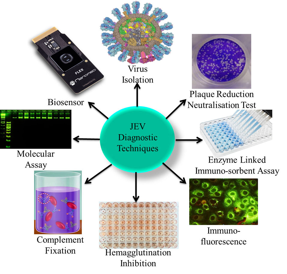 Various different types of JEV diagnostic techniques including clinical, serological and pathological are used to conclusively diagnose JEV such as Virus Isolation, PRNT, ELISA, IFA, HI, CFT, Molecular Assay, and Biosensor detection.