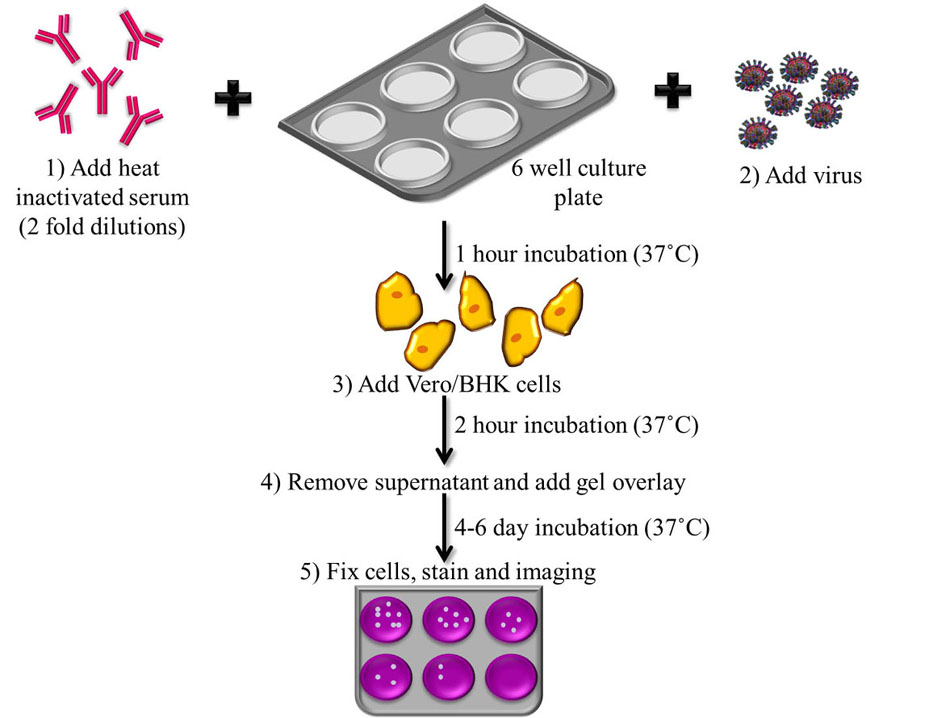 Flowchart depicting the steps involved in Plaque Reduction Neutralization Test. 1) Incubation of JE virus with heat inactivated serum at 37 ˚C, 2) Addition of virus, 3) Plating onto monolayers of cell lines with 2 h incubation at 37 ˚C, 4) Gel overlay is added and 5) Plaques are allowed to form over 4-6 days by incubating at 37 ˚C which are then fixed, stained and titer determined by Plaque forming unit (PFU).