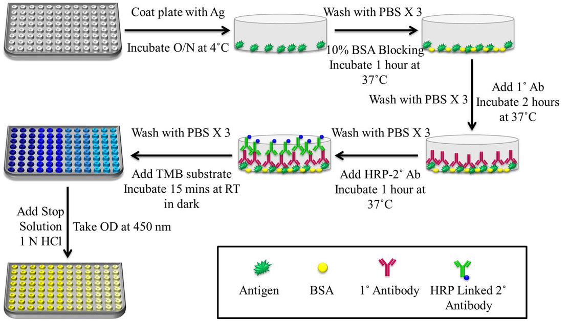 Schematic representation of a basic protocol for indirect ELISA. The steps include coating of plate with Ag for overnight incubation at 4 ˚C, followed by washing with 0.02% Phosphate Buffer Saline-Tween 20 (PBS-T) and blocking for 1 h at 37 ˚C with 2% Skimmed Milk in Phosphate Buffer Saline-Skimmed Milk (PBS-M) or Bovine Serum Albumin (BSA). After washing with 0.02% PBS-T, Primary antibody (1˚ Ab) was allowed to incubate for 2 h at 37 ˚C, followed by washing with 0.02% PBS-T and Secondary antibody (2˚ Ab)-HRP incubation for 1 h at 37 ˚C. 3,3’,5,5’-Tetramethylbenzidine (TMB) substrate was added and after 15 min of incubation in the dark, 1 N Sulfuric Acid (H2SO4) was added as stop solution and absorbance was taken at 450 nm since the yellow colour formed after addition of stop solution gives a UV peak reading at 450 nm.