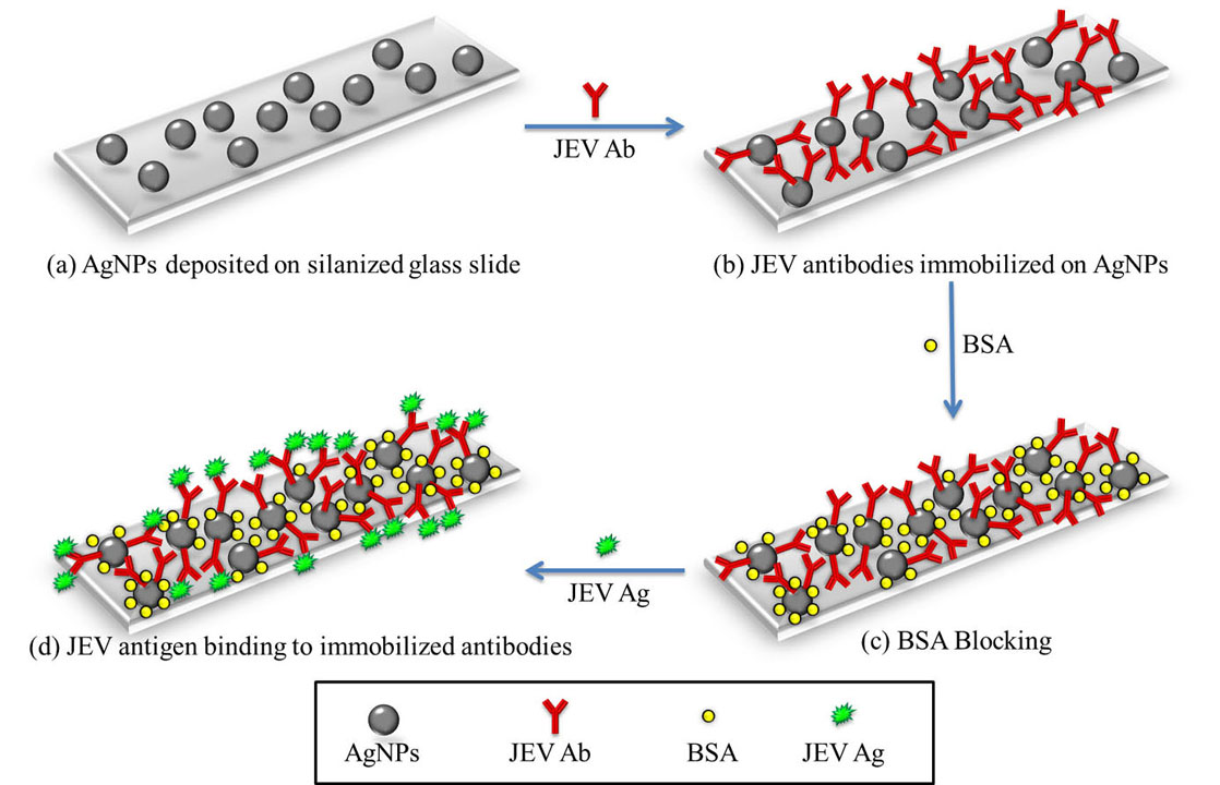 (a) AgNPs were first synthesized and deposited onto a silanized glass slide using APTES. (b) JEV antibodies were immobilized onto the AgNPs. (c) The unbound surface of the AgNPs were blocked by BSA to avoid non-specific binding of the antigen. (d) The JEV antigen bind to the antibodies and were detected by checking absorbance at 427 nm since AgNPs show a UV absorbance peak at 427 nm and as the AgNPs conjugate with different analytes, a shift in this peak is observed.