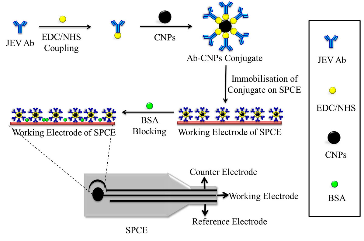The schematic representation of the fabrication of CNPs based SPCE biosensor for the detection of JEV. The antibody is bound to the CNPs by EDC/NHS coupling and then immobilized on the working electrode of the SPCE. The unspecific binding sites on the electrode are blocked using BSA. All steps of the fabrication process are characterized using CV and EIS.