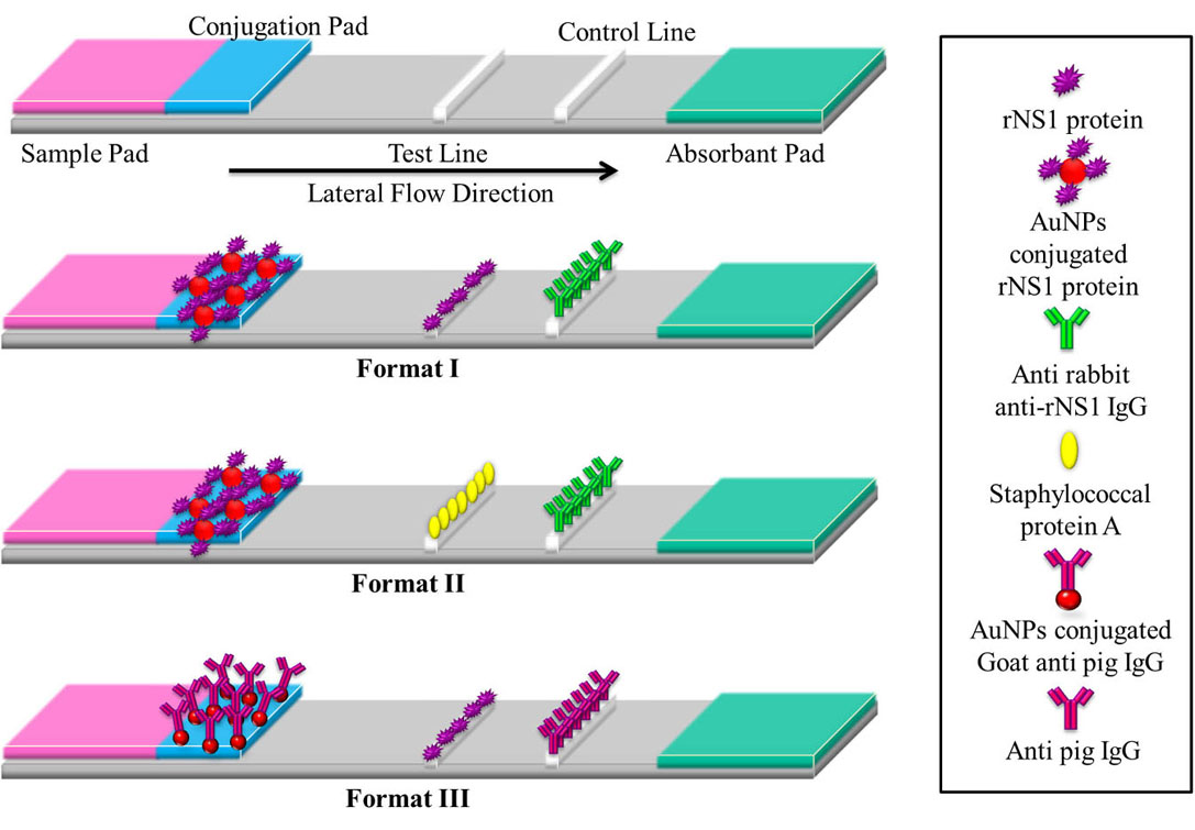 The basic layout of a lateral flow assay strip comprises of a base nitrocellulose membrane, a sample pad for loading of sample, a conjugation pad for immobilization of bio recognition element, a test line for detection of analyte and a control line for confirmation of flow. Format I- AuNPs conjugated rNS1 protein immobilized on conjugation pad, rNS1 protein on test line and anti-rabbit anti-rNS1 IgG on control line. Format II- AuNPs conjugated rNS1 protein immobilized on conjugation pad, staphylococcal protein A on test line and anti-rabbit anti-rNS1 IgG on control line. Format III- AuNPs conjugated Goat anti-pig IgG on conjugation pad, rNS1 protein on test line and Anti-pig IgG on control line.