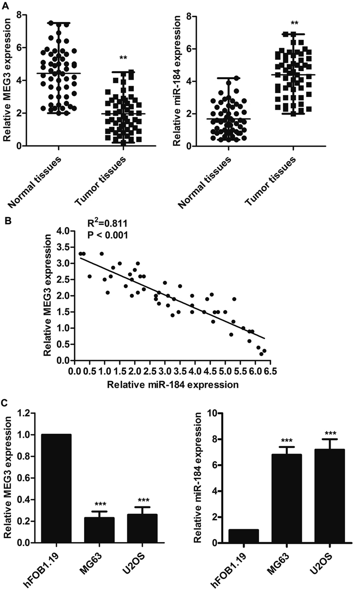 Figure 1Expression levels of MEG3 and miR-184. A. The relative expressions of MEG3 and miR-184 were assessed by using RT-PCR followed by qPCR in normal and tumor tissues. B. Scatter diagram representing the non-linear relationship between MEG3 and miR-184 based on the result of RT-PCR followed by qPCR. C. The levels of MEG3 and miR-184 expression were quantified by RT-PCR followed by qPCR in Hfob1.19, MG63 and U2OS cell lines. The experiments were repeated at least 3 times. Error bars represent ± SD. (**P < 0.01, ***P < 0.001 versus control group; # P < 0.05, ## P < 0.01 versus control mimic group).