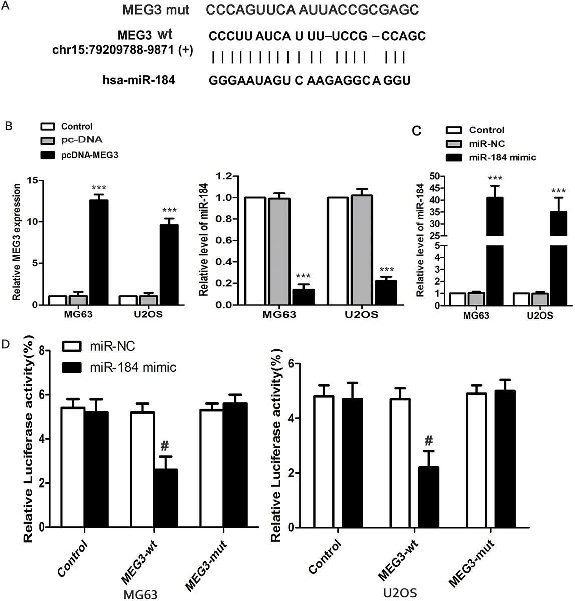 Figure 2MEG3 directly interacts with miR-184. A. The sequence of miR-184, MEG3 wt and MEG3 mut. B. The expression levels of MEG3 and miR-184 were evaluated by RT-PCR followed by qPCR in MG63 and U2OS cells transfected with or without pcDNA-MEG3. C. The level of miR-184 was assessed using RT-PCR followed by qPCR in MG63 and U2OS cells transfected with or without miR-184 mimic. D. Relative luciferase activities of wild type (WT) and mutated (Mut) MEG3 reporter plasmid in MG63 and U2OS cells co-transfected with miR-184. Description: The experiments were repeated at least 3 times. Error bars represent ± SD. (**P < 0.01, ***P < 0.001 versus control group; ## P < 0.01 versus miR-184 mimic group). Notice: the expression of MEG3 and miR-184 in the control was considered as 1; miR NC: negative control miR mimics; control: cells did not be transfected.