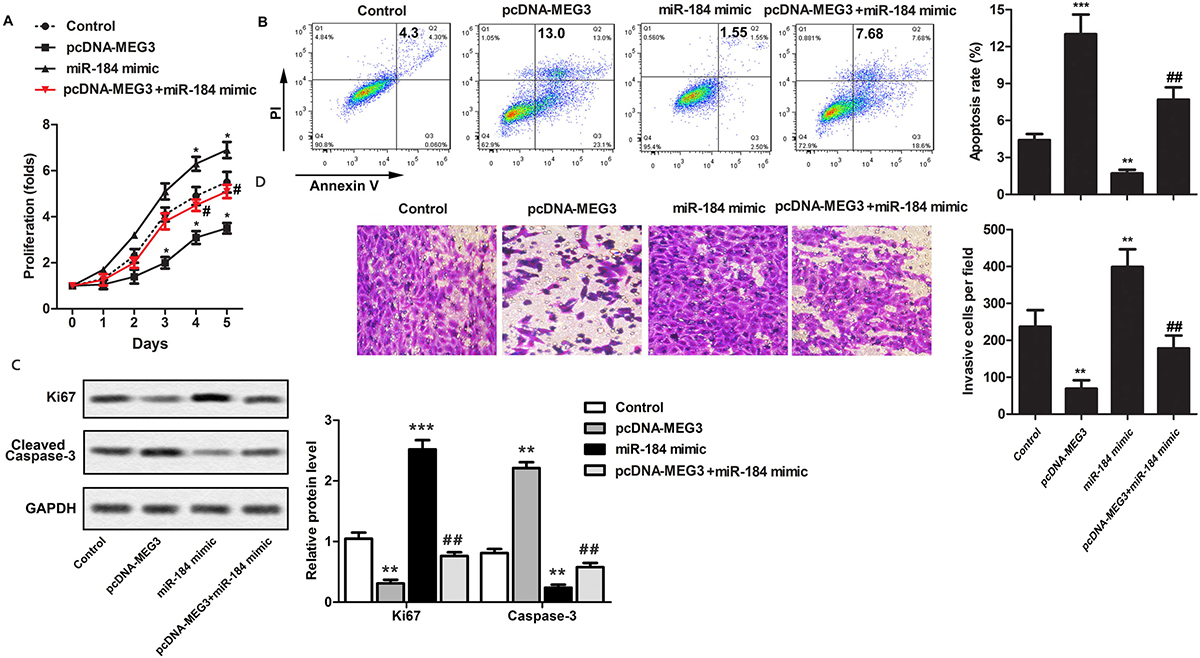 Figure 3Up-regulation of MEG3 inhibits the OS tumor cell properties via targeting miR-184. MG63 cells were randomly divided into 4 groups: Control group, pcDNA-MEG3 group, miR-184 mimic group, pcDNA-MEG3 + miR-184 mimic group. A. The proliferation of MG63 cells was measured using CCK-8. B. Apoptosis was assessed by flow cytometric analysis of Annexin V. C. Western blotting of Ki67, and cleaved caspase-3. D. Mobility of MG63 cells was assessed by transwell assay. The experiments were repeated at least 3 times. Error bars represent ± SD. (*P < 0.05, **P < 0.01, ***P < 0.001 versus control group; # P < 0.05, ## P < 0.01 versus miR-184 mimic group).