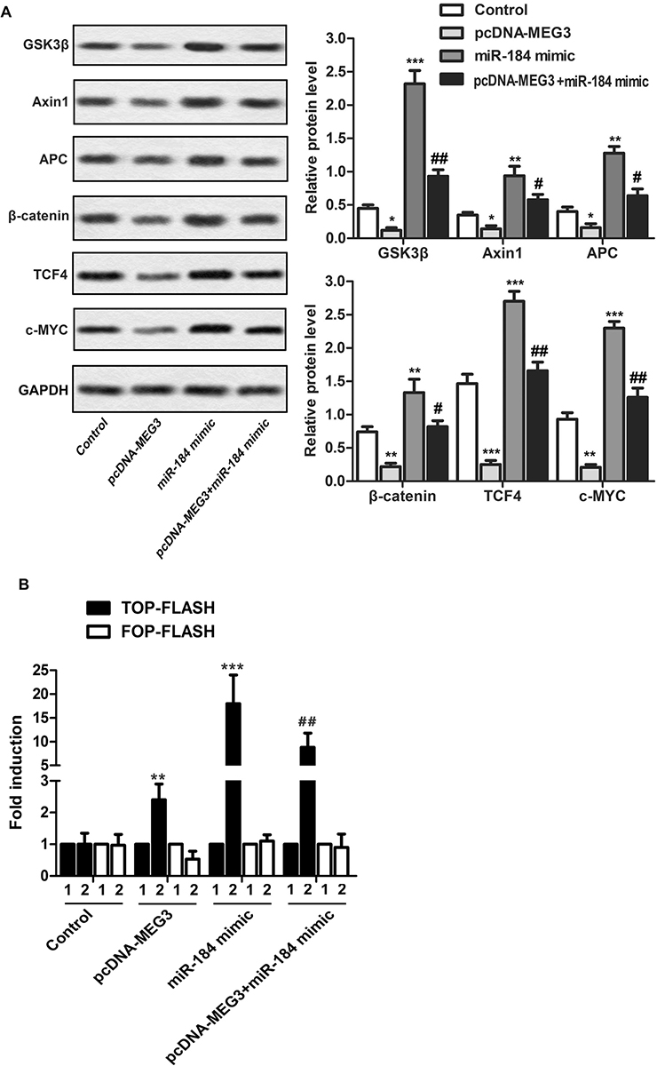 Figure 4MEG3 suppresses the Wnt/β-catenin pathway via targeting miR-184. MG63 cells were randomly divided into 4 groups. MG63 cells were randomly divided into 4 groups: Control group, pcDNA-MEG3 group, miR-184 mimic group, pcDNA-MEG3 + miR-184 mimic group. A. Western blotting of GSK3β, Axin1, APC, β-catenin, TCF4, and c-MYC. B. lane 1: MG63 cells were transfected with the TOP- or FOP-FLASH firefly luciferase reporter plasmids including empty expression vectors, or with β-catenin and TCF-4 expression vectors. Data are presented as fold induction relative to the co-transfection of the reporter plasmid (either TOP- or FOP-FLASH) with the empty expression vectors. The experiments were repeated at least 3 times. Error bars represent ± SD. (*P < 0.05, **P < 0.01, ***P < 0.001 versus control group; # P < 0.05, ## P < 0.01 versus miR-184 mimic group).