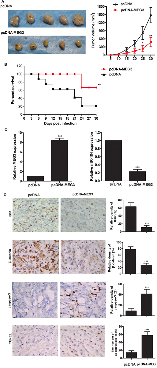 Figure 5MEG3 inhibits OS via targeting miR-184 in vivo. Nude mice were randomly divided into groups; those received MG63 tumor cells without or after being transduced with pcDNA-MEG3. Tumor volume (A), percent survival (B) were assessed on different days after introduction to the tumor cells. C. Paraffin sections of tumors were immunostained for Ki67, β-catenin, caspase 3 and TUNEL. The experiments were repeated at least 3 times. Error bars represent ± SD. (*P < 0.05, **P < 0.01, ***P < 0.001 versus control group).