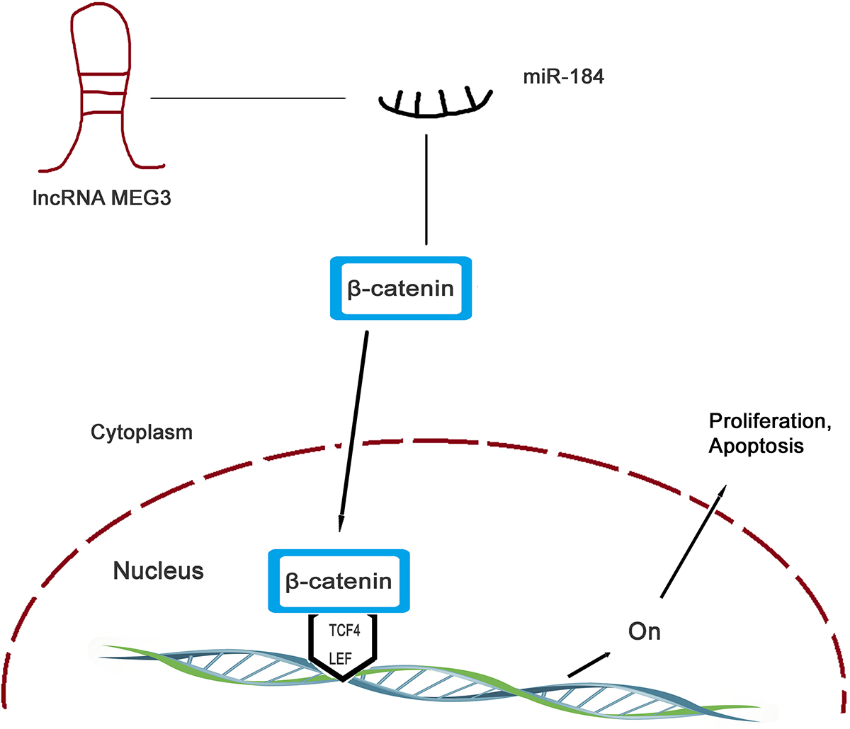 Figure 6Schematic diagram of the regulatory mechanism of MEG3/miR-184/β-catenin axis in the inhibition of osteosarcoma proliferation.