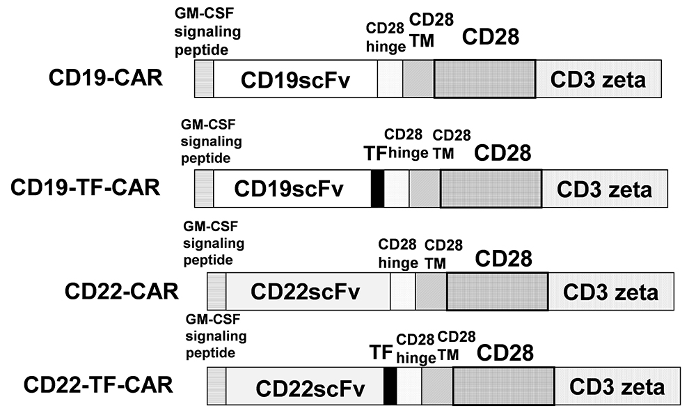 Figure 1The structure of CD19-TF and CD22-TF- CAR. TF, Transferrin epitope; ScFv, single chain variable fragment. TM is transmembrane domain; CD28 is CD28 co-stimulatory domain; CD3 zeta-activation domain.