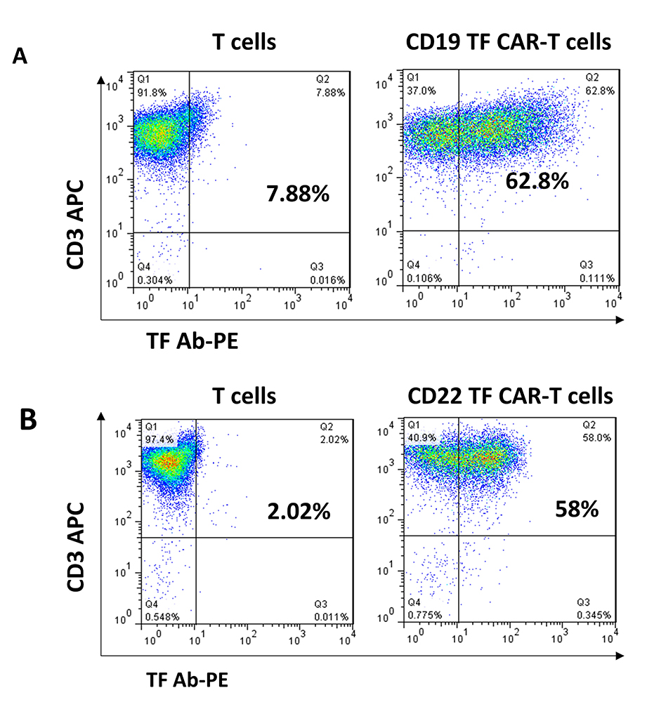CD19, CD19-TF, CD22 and CD22-TF CAR lentivirus were used for transduction of T cells (Figure 1). All CAR-T cells were effectively expanded. FACS with TF antibody was performed to detect TF-positive CAR-T cells at day 9 after transduction (Figure 2). T cells transduced with CD19-TF CAR or CD22-TF CAR had increased fluorescence of 1-2 logs compared to non-transduced T cells. After background correction, 54-57% of transduced T cells were positive for the TF epitope showing high level of CAR-positive cells (Figure 2). Thus, TF epitope can be used for detection of TF-positive CD19-TF or CD22-TF-CAR-T cells.