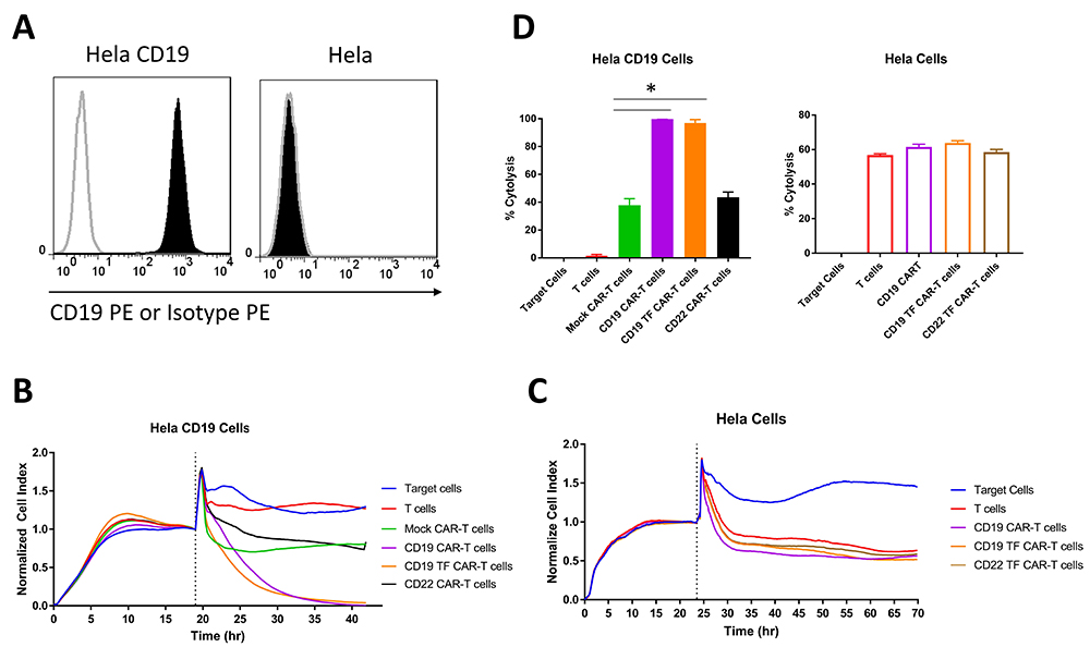 Figure 3Real-time cytotoxicity assay (RTCA) with CD19 TF-CAR-T cells, CD19-CAR-T cells and CD19-positive Hela cervical cancer target cells. A. Expression of CD19 in Hela-CD19 stable cell line by FACS with CD19 antibody (black, filled) Isotype control (grey, unfilled). B. RTCA plot with Hela-CD19 target cells. C. RTCA with negative control Hela target cells. 10:1 ratio of Effector to Target cells was used. Mock-CAR-T cells and T cells were used as negative control cells against Hela-CD19-positive cells. Both CD19-TF and CD19-CAR-T cells effectively killed Hela-CD19-positive cells. D. Endpoint cytotoxicity from RTCA. Bars represent % of Cytolysis calculated as described in Materials and Methods. Hela-CD19 ANOVA p < 0.0001, Tukey test * p-value < 0.0001 CD19 or CD19-TF vs mock CAR-T cells.