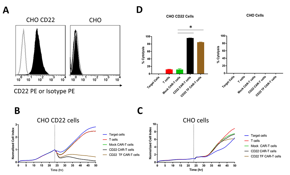 Figure 4RTCA with CD22 TF-CAR-T cells, CD22-CAR-T cells and CD22-positive CHO target cells. A. Expression of CD22 in CHO-CD22 stable cell line. FACS was performed on CHO-CD22 stable cell line. CD22 antibody (black, filled), Isotype control (grey, unfilled). B. RTCA assay with CD22-TF and CD22-CAR-T cells and CHO-CD22 cells. C. RTCA assay as in B with CHO negative control cells. D. Endpoint Cytotoxicity from RTCA. Bars represent % of Cytolysis calculated as described in Materials and Methods. CHO-CD22 ANOVA p < 0.0001, Tukey test * p-value < 0.0001 CD22 or CD22-TF vs mock CAR-T cells.