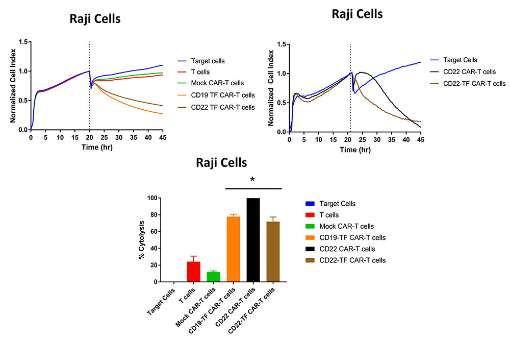 Figure 5RTCA with Raji cells. Both CD19-TF and CD22-TF effectively killed Raji cells. Left upper panel: RTCA plot; Right upper panel: CD22 and CD22 have similar cytotoxicity against Raji cells. Lower panel: Endpoint cytotoxicity from RTCA. The quantification is based on two independent experiments. Each sample was analyzed in triplicate. ANOVA p < 0.0001, Tukey test * p-value < 0.0001 CD19-TF or CD22-TF vs mock CAR-T cells.