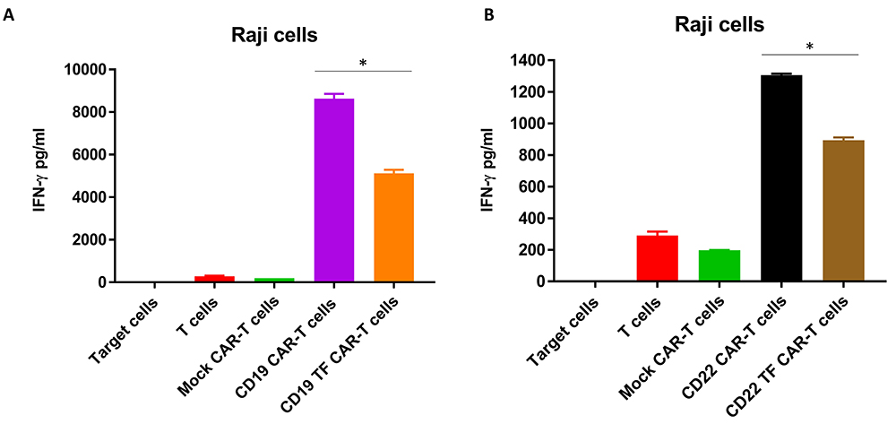 Figure 6CD19-TF (A) and CD22-TF (B)-CAR-T cells secrete significantly less IFN-gamma than CD19 and CD22-CAR-T cells. A. IFN-gamma secretion from RTCA with CD19-TF CAR-T and CD19 CAR-T (ANOVA p < 0.0001, Tukey test * p < 0.0001 vs CD19-TF vs CD19. B. IFN-gamma secretion from RTCA with CD22-TF CAR-T and CD22 CAR-T (ANOVA p < 0.0001, CD22-TF vs CD22 Tukey test * p < 0.0001).