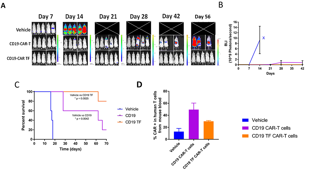 Figure 7CD19-TF-CAR-T cells significantly decrease Raji xenograft tumor growth. A. In vivo imaging of Raji-luciferase positive xenograft tumors. B. Total Raji-luciferase photon flux as measure of tumor growth (Student’s T-test CD19-TF versus PBS control p < 0.05). C. Kaplan-Meier plot shows significantly increased survival of CD19-TF and CD19-CAR-T cell treated mice versus vehicle treated mice (Log-rank test p <0.0025, p < 0.0042 respectively). D. Detection of CD19-CAR-T cells in mouse blood by FACS Student’s T test CD19-TF CAR-T vs vehicle control p <0.05).