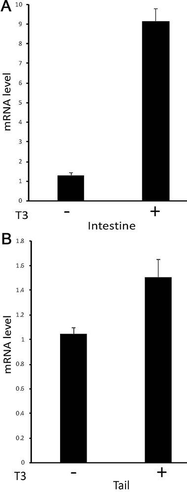 Figure 1MBD3 expression is up-regulated by T3 treatment of premetamorphic Xenopus tropicalis tadpoles. Intestinal (A) and tail (B) RNAs were extracted from premetamorphic tadpoles at stage 54 treated with or without 10 nM T3 for 2 days and subjected to cDNA synthesis. qRT-PCR was conducted to examine the expression of MBD3 and control gene EF1α (elongation factor 1α) mRNAs, respectively. MBD3 expression was normalized against that of EF1α in the same cDNA samples and presented as mean +/- standard error of the mean (S.E.M). Unpaired t-test with Welch’s correction was done to compared the two samples (* p<0.05).