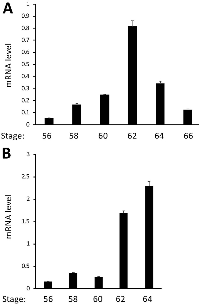 Figure 2MBD3 expression peaks at the climax of metamorphosis in the intestine and tail during natural metamorphosis. Intestinal (A) and tail (B) RNAs were extracted from metamorphosing tadpoles and subjected to cDNA synthesis. qRT-PCR was conducted to examine the expression of MBD3 and control gene EF1α, respectively. MBD3 expression was normalized against that of EF1α in the same cDNA samples and presented as mean +/- standard error of the mean (S.E.M). One-way ANOVA followed by Boferroni’s test was done to compare the samples (* p<0.05).