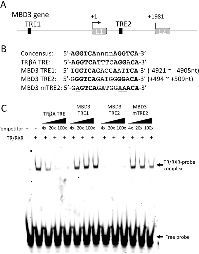 Figure 3TR binds to a putative TRE within the first intron of the MBD3 gene in vitro. (A) Schematic diagram showing two putative TREs (solid boxes) in X. tropicalis MBD3 gene. (B) The sequences of the putative TREs are shown in comparison with the sequences of consensus TRE and the TRE of Xenopus laevis TRβA gene (TRβA TRE). The numbers indicate the locations relative to the transcriptional start site of MBD3 gene based on the 5’-terminus of the reported MBD3 cDNA sequence (denoted as +1). A mutant version of MBD3 TRE2 (MBD3 mTRE2, with the mutated nucleotides underlined) was made for TR/RXR binding assay in comparison with the wild type TREs. Bold letters indicate nucleotides conserved with the consensus TRE. Note that the putative TRE1 (MBD3 TRE1) is in the 5’-proximity of its promoter and the putative TRE2 (MBD3 TRE2) is in the first intron of the gene. E1: exon1; E2: exon2. (C) The putative MBD3 TRE2 but not TRE1 compete for binding to TR/RXR heterodimers against labeled TRβA TRE in a gel mobility shift assay. The labelled double stranded probe containing TRβA TRE was mixed with in vitro translated TR/RXR heterodimers in the presence or absences of 4x, 20x, or 100x of unlabelled wild type or mutant MBD3 TREs as indicated. The reaction mixtures were analyzed by electrophoretic mobility shift assay (EMSA). The mock in vitro translation mixture was used as a negative control for TR/RXR heterodimers (lane 1 on the left). The locations of TR/RXR bound probe (TR/RXR-probe complex) and unbound probe (Free probe) are indicated with arrows. Note that MBD3 TRE1 had little competition against the labelled TRβA TRE probe while MBD3 TRE2 strongly competed against the labelled probe. Mutations in the MBD3 TRE2 drastically reduced its ability to compete against the labeled probe for TR/RXR binding.