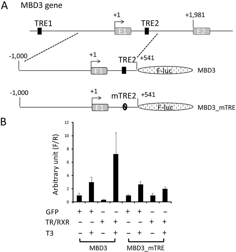 Earlier ChIP-on-Chip analysis showed that TR was associated with MBD3 gene in the intestine of premetamorphic Xenopus tropicalis tadpoles. Our bioinformatics analysis discovered two putative TREs flanking the predicted transcription start site. The putative TRE1 found in the upstream of MBD3 transcriptional start site had no detectable binding to TR/RXR heterodimer in vitro, suggesting it unlikely a functional TRE in vivo. In contrast, the TRE located in the first intron, TRE2, can bind to TR/RXR heterodimers in vitro and is required for the activation of the MBD3 promoter in the reconstituted Xenopus oocyte transcription system in vivo. More importantly, TRE2 is bound by TR in the tadpole intestine and T3 treatment of premetamorphic tadpoles leads to increased level of the activation histone mark H3K79 methylation and recruitment of RNA polymerase II to the TRE2 in the tadpole intestine. Thus, TRE2 is likely responsible for mediating direct transcriptional activation of the MBD3 gene by liganded TR/RXR.