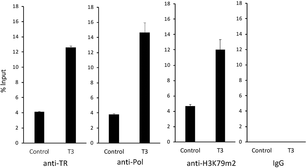 Figure 5TR binds to the intronic TRE of MBD3 gene in the intestine during T3-induced metamorphosis. Premetamorphic tadpoles at stage 54 were treated with (T3) or without T3 (Control) for 2 days. The intestines were dissected out for ChIP assays with a polyclonal antibody against frog TR (anti-TR), RNA polymerase II (anti-Pol), and histone H3 K79m2 (anti-H3K79m2), or negative control IgG (IgG). The immunoprecipitated DNA was analyzed by qPCR for the enrichment of the intronic TRE2 region of the MBD3 gene (MBD3 TRE). Note that strong binding of TR to the MBD3 intronic TRE was observed in the absence of T3 in the premetamorphic tadpoles, and this binding was increased significantly upon T3 treatment. T3 treatment also drastically enhanced the recruit of RNA polymerase II and the level of H3K79 methylation.