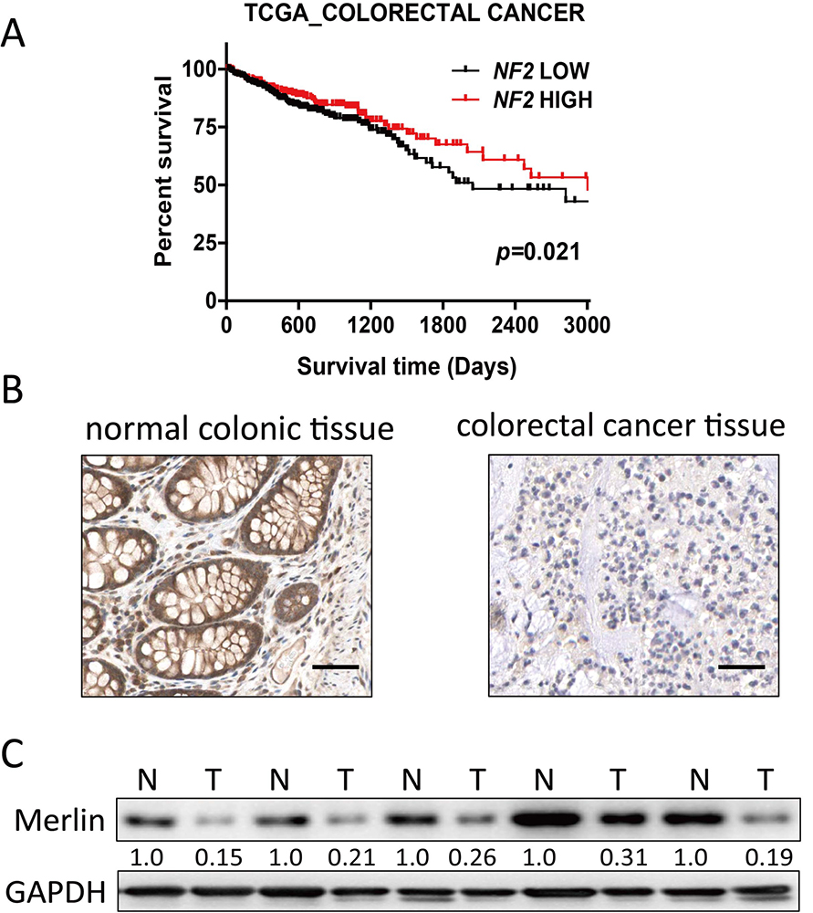 Figure 1NF2/Merlin is reduced in colorectal cancer tissue compared with normal colonic tissue and its expression correlates with good prognosis. (A) Kaplan–Meier analyses of the correlation between the expression level of NF2 and the prognosis of colorectal cancer (derived from TCGA_COLORECTAL CANCER database). (B) Representative images of Merlin staining in colorectal cancer and normal colonic tissue (scale bar = 50 micrometers). (C) Westerb blotting of Merlin in 5 colorectal cancer and corresponding normal colonic tissues.