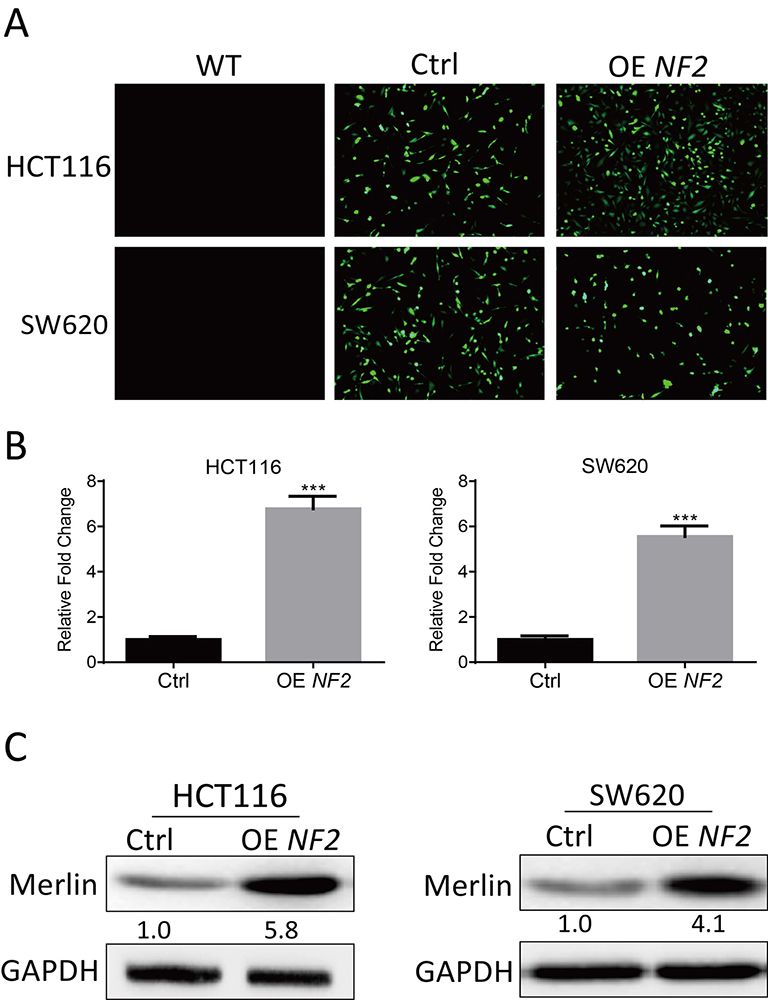 Figure 2Lentivirus-mediated NF2-overexpression increases the expression of Merlin in HCT116 and SW620 cells. (A) Representative images of GFP-positive HCT116 and SW620 cells and corresponding control cells. (B) qRT-PCR of NF2 in HCT116 and SW620 cells. (C) Western blotting of Merlin was detected in HCT116 and SW620 cells. Data are means ± SD.*, P < 0.05; **, P < 0.01; ***, P < 0.001.