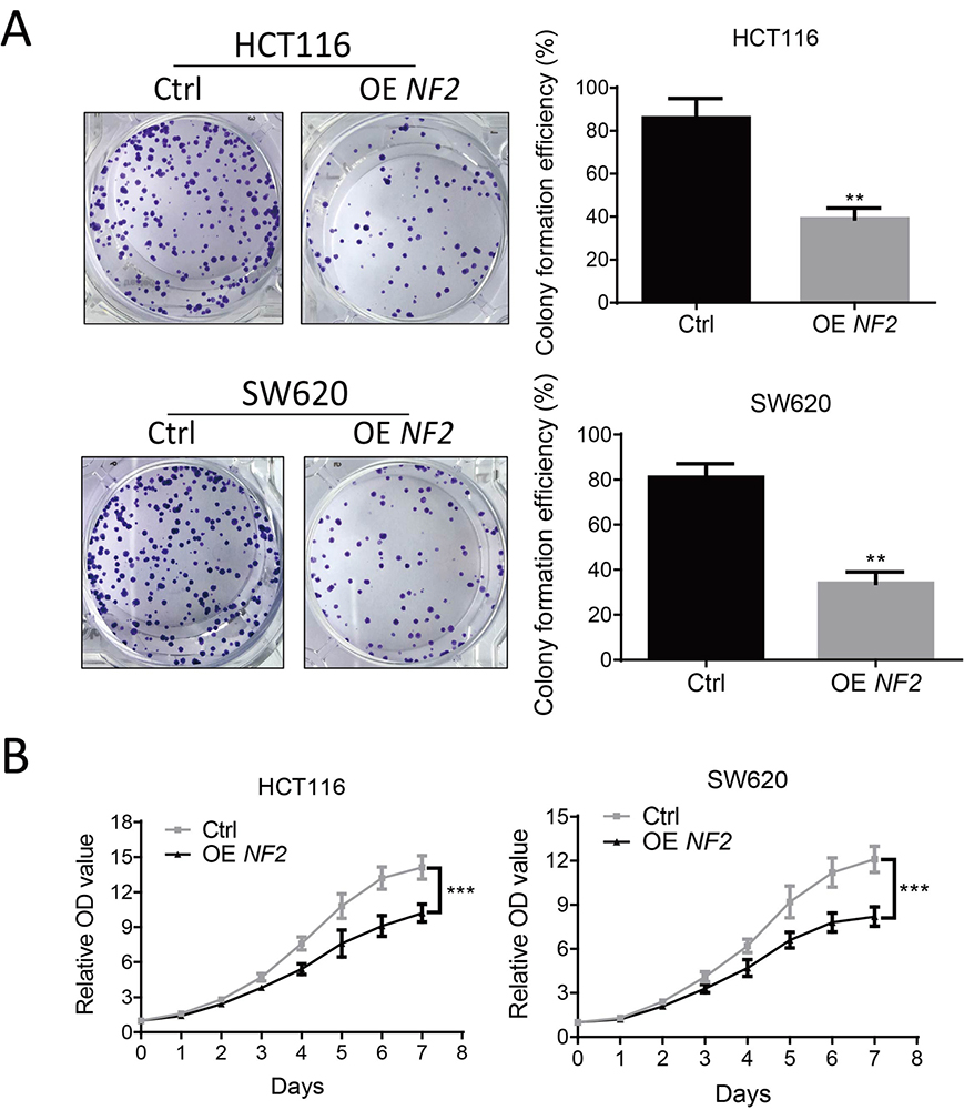 Figure 3Overexpression of NF2 inhibits colony formation and proliferation of colorectal cancer cells. (A) Representative images of colonies formed in HCT116 and SW620 cells overexpressing NF2 and by control cells. Histogram showing the efficiency of colony formation. (B) CCK-8 assay showing the proliferative ability of in HCT116 and SW620 cells overexpressing NF2 and control cells. Data are means ± SD.*, P < 0.05; **, P < 0.01; ***, P < 0.001.