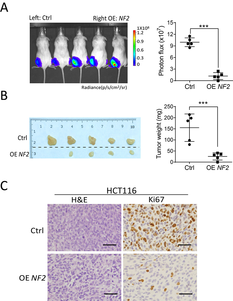 Figure 4Overexpression of NF2 inhibits proliferation of colorectal cancer cells in vivo. (A) In vivo bioluminescent images and the quantification of xenografts formed by in HCT116 and SW620 cells overexpressing NF2 and control. (B) Subcutaneous xenografts formed by in HCT116 and SW620 cells overexpressing NF2 and contros. (C) H&E staining and of Ki67 immunohistochemically detected in xenograft tumors formed by in HCT116 and SW620 cells overexpressing NF2 and controls. Scale bar=50 um. Data are means ± SD. ***, P < 0.001.