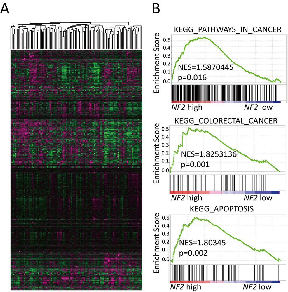 The microarray data from 104 laser microdissected tumor tissue samples from colorectal cancer patients (GSE21510) were downloaded from GEO DataSets. These data were used to separate those that show low versus a high NF2 expression level by finding the cut-off value of median expression of this gene. Then, we carried out the Gene Set Enrichment Analysis (GSEA) and GSEA enrichment analysis (http://www.broadinstitute.org/gsea/index.jsp) with KEGG_PATHWAY_IN_ CANCER, KEGG_COLORECTAL_CANCER and KEGG_APOPTOSIS gene set.