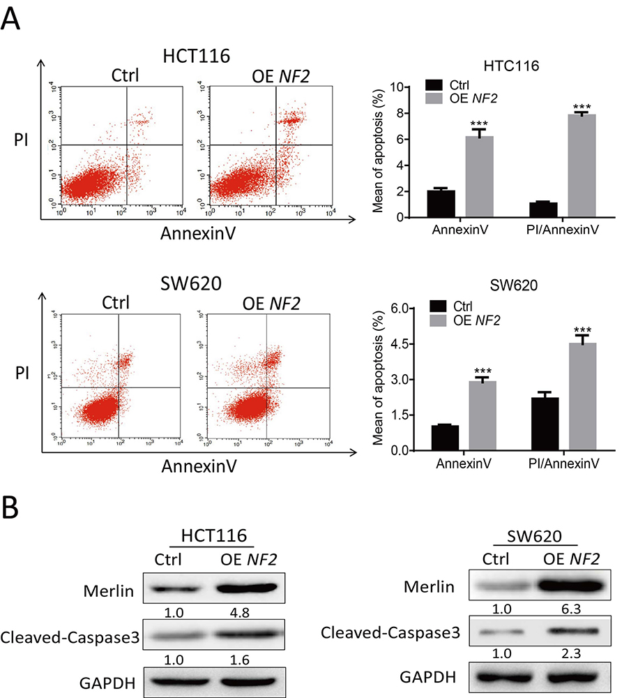 Figure 6Overexpression of NF2 induces apoptosis in colorectal cancer cells. (A) Flow cytometric analysis of apoptotic cells in in by in HCT116 and SW620 cells overexpressing NF2 and control. Histogram shows the percentage of early/late apoptotic cells. (B) Western blotting of Merlin and Cleaved-Caspase3 by in HCT116 and SW620 cells overexpressing NF2 and control. Data are means ± SD.*, P < 0.05; **, P < 0.01; ***, P < 0.001.