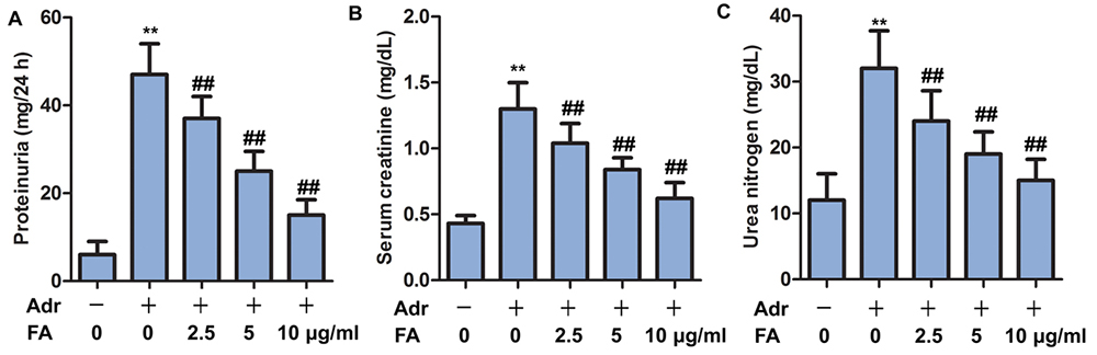 All animal experiments were carried out in accordance with the NIH Guidelines for the Care and Use of Laboratory Animals and were approved by The Third Affiliated Hospital of Wenzhou Medical University. A total of 70 Sprague Dawley rats (male, 6-week-old, 150-170 g) were obtained from the Animal Center of The Third Affiliated Hospital of Wenzhou Medical University and housed in a controlled environment at temperature of 25 ± 3, and humidity of 60% in a 12h light/dark cycle with free access to food and water. Rats were randomly assigned to seven groups with 10 rats in each group: Control group rats were intravenously injected with saline. Experimental animals were injected with Adr diluted in 0.9% saline in the tail vein to a final dose of 6.5 mg/kg. Adr + FA group, received received 2.5, 5 or 10 μg/ml FA and 6.5 mg/kg. Adr. After four weeks, the rats were euthanized and sera, urine and kidneys were collected. Sera were stored at – 800 C until analysis. Levels of protein in the urine, serum creatinine and urea nitrogen were quantified by an automatic chemical analyzer.