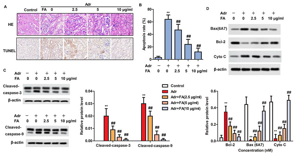 Figure 2FA remits pathological damage by inhibiting apoptosis in Adr-induced nephropathy. The rats are randomly assigned to seven groups with 10 in each group: Control group, rats are injected with equivalent saline intravenously; Adr group, rats are injected with Adr diluted in 0.9% saline from the tail vein to a final dose of 6.5 mg/kg; Adr + FA (2.5 μ g / ml) group, rats injected with Adr are treated with 2.5 μ g / ml FA; Adr + FA (5 g/ml) group, rats injected with Adr are treated with 5 g/ml FA; Adr + FA (10 g/ml) group, rats injected with Adr are treated with 10 μ g / ml FA. A. Adr-induced renal pathological injury is detected by H&E staining and apoptosis rate is detected by TUNEL staining. ( × 400 times) B: Statistics of TUNEL staining results; C and D. The protein levels of cleaved-caspase-3, cleaved-caspase-9, Bax (6A7), Bcl-2 and Cyto C are detected by western blotting; **, p < 0.01 versus Control group; ##, p < 0.01 versus Adr group.