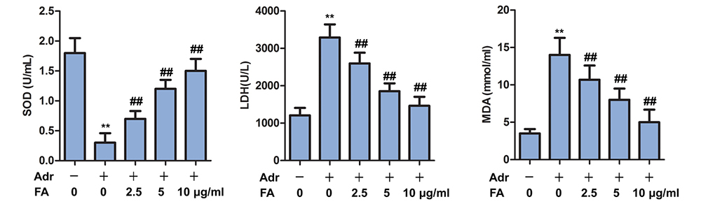 Figure 3FA alleviates Adr-induced oxidative stress. The rats are randomly assigned to seven groups with 10 in each group: Control group, rats are injected with equivalent saline intravenously; Adr group, rats are injected with Adr diluted in 0.9% saline from the tail vein to a final dose of 6.5 mg/kg; Adr + FA (2.5 μ g / ml) group, rats injected with Adr are treated with 2.5 μ g / ml FA; Adr + FA (5 g/ml) group, rats injected with Adr are treated with 5 g/ml FA; Adr + FA (10 g/ml) group, rats injected with Adr are treated with 10 μ g / ml FA. The contents of SOD, MDA, LDH are detected by SOD, MDA, LDH kit; **, p < 0.01 versus Control group; ##, p < 0.01 versus Adr group.