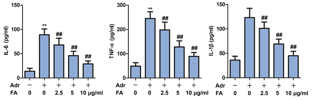 Figure 4FA inhibits inflammatory response in Adr-induced nephropathy. The rats are randomly assigned to seven groups with 10 in each group: Control group, rats are injected with equivalent saline intravenously; Adr group, rats are injected with Adr diluted in 0.9% saline from the tail vein to a final dose of 6.5 mg/kg; Adr + FA (2.5 μ g / ml) group, rats injected with Adr are treated with 2.5 μ g / ml FA; Adr + FA (5 g/ml) group, rats injected with Adr are treated with 5 g/ml FA; Adr + FA (10 g/ml) group, rats injected with Adr are treated with 10 μ g / ml FA. The contents of inflammatory factors IL-6, IL-1β, TNF-α are detected by ELISA. **, p < 0.01 versus Control group; ##, p < 0.01 versus Adr group.