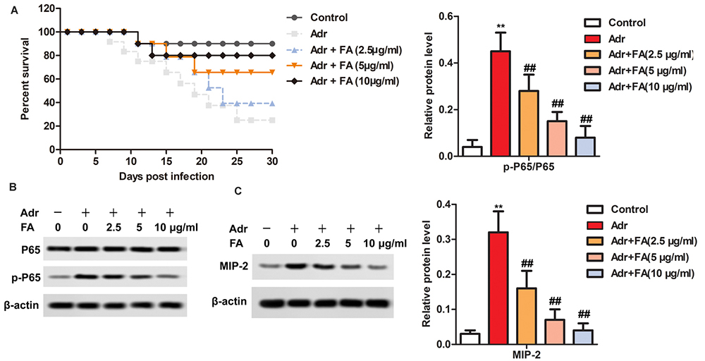 Figure 5FA inhibits the activation of NF-kappaB / MIP-2 pathway in Adr-induced nephropathy. The rats are randomly assigned to seven groups with 10 in each group: Control group, rats are injected with equivalent saline intravenously; Adr group, rats are injected with Adr diluted in 0.9% saline from the tail vein to a final dose of 6.5 mg/kg; Adr + FA (2.5 μ g / ml) group, rats injected with Adr are treated with 2.5 μ g / ml FA; Adr + FA (5 g/ml) group, rats injected with Adr are treated with 5 g/ml FA; Adr + FA (10 g/ml) group, rats injected with Adr are treated with 10 μ g / ml FA. A. Survival curve. B. The protein levels of p65 and MIP-2 are detected by western blotting. **, p < 0.01 versus Control group; ##, p < 0.01 versus Adr group.