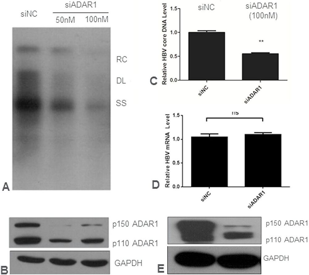 Figure 1The knockdown of ADAR1 proteins decreased HBV replication. (A and B) Huh7 cells were transfected with 50 nM and 100 nM siADAR1 or siNC for 16h and then transfected with 2 ug of HBV plasmid pCH9/3091, and HBV replicative intermediates in the cells were evaluated at 48 h after transfection by Southern blotting (A) and the efficiency of ADAR1 siRNA knockdown was confirmed by Western blotting (B). (C, D, and E) Relative expression of HBV DNA (C) and RNA (D) in the HepG2.2.1.5 were detected by qPCR at 48h posttransfected with 100 nM ADAR1 siRNA. The levels of ADAR1 expression were detected by western blot (E). **P<0.01 from three independent experiments.