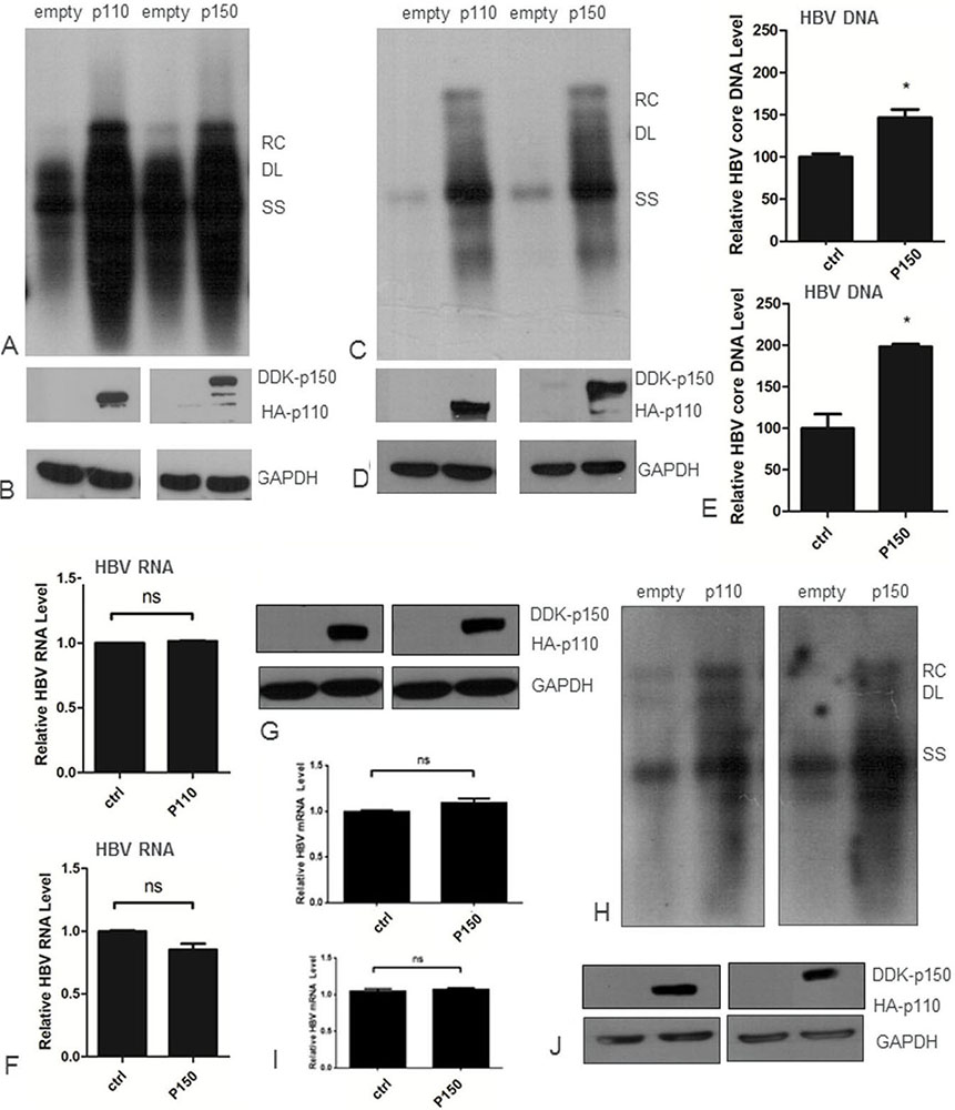Figure 2Overexpression of ADAR1 facilitates the replication of HBV. (A, B, C, and B) 0.4ug of HBV plasmid pCH9/3091 were cotransfected with 1.2ug empty and ADAR1 constructs (P110 or P150) into Huh7 cells (A and B) and HepG2 cells (C and D), HBV DNA replicative intermediates were detected by Southern blotting (A, C). (E, F, G, H, I, and J) 1.2ug ADAR1 constructs (P110 or P150) were transfected into HepG2.2.1.5 cells and HepAD38 cells, HBV DNA and mRNA were detected by qPCR in HepG2.2.1.5 cells (E and F) and southern blot in HepAD38 cells (H and I). The levels of ADAR1 protein were detected by western blot using anti-HA or anti-DDK antibody. GAPDH was used as an internal control. *P<0.05 from three independent experiments.