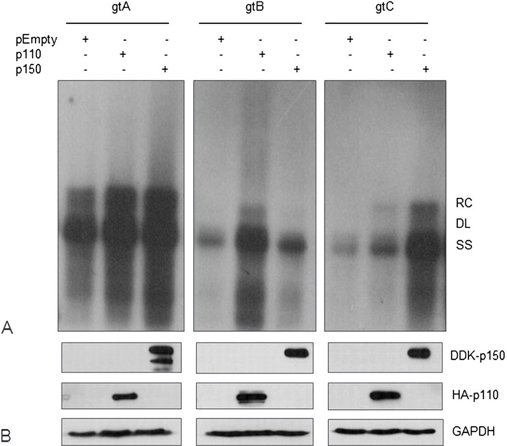 Figure 3ADAR1 increased HBV replication of genotypes A, B and C. 0.4ug of genotype A, B or C HBV constructs were co-transfected with 1.2ug of P110 or P150 construct into Huh7 cells. HBV replicative intermediates were analyzed by Southern blot (A). ADAR1 expressions were confirmed by western blot using anti-HA or anti-DDK antibody (B). GAPDH was used as an internal control.